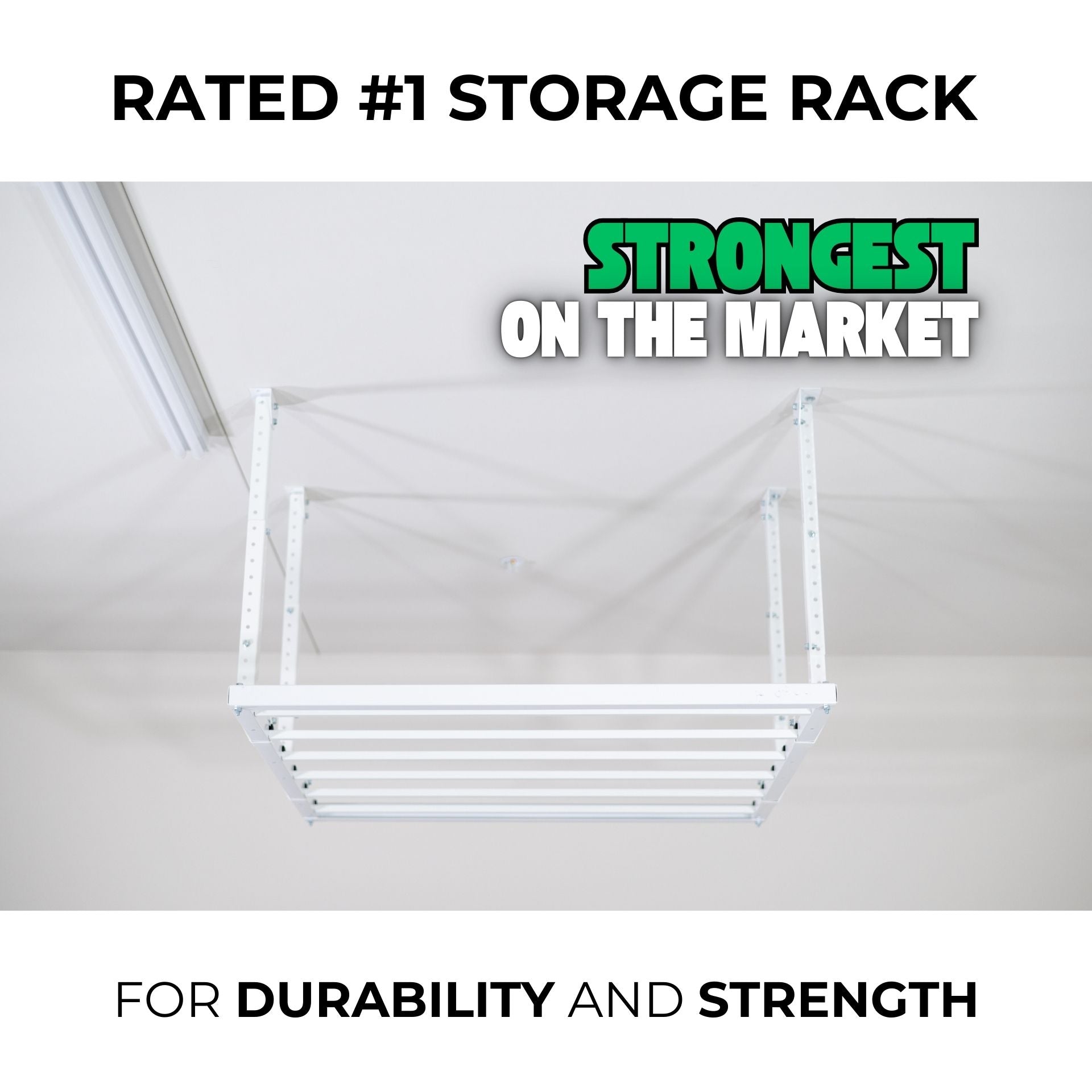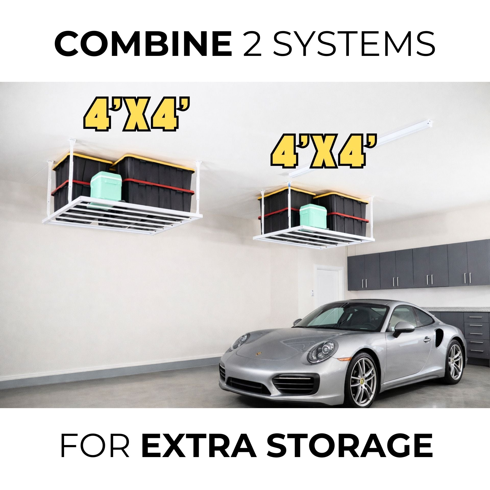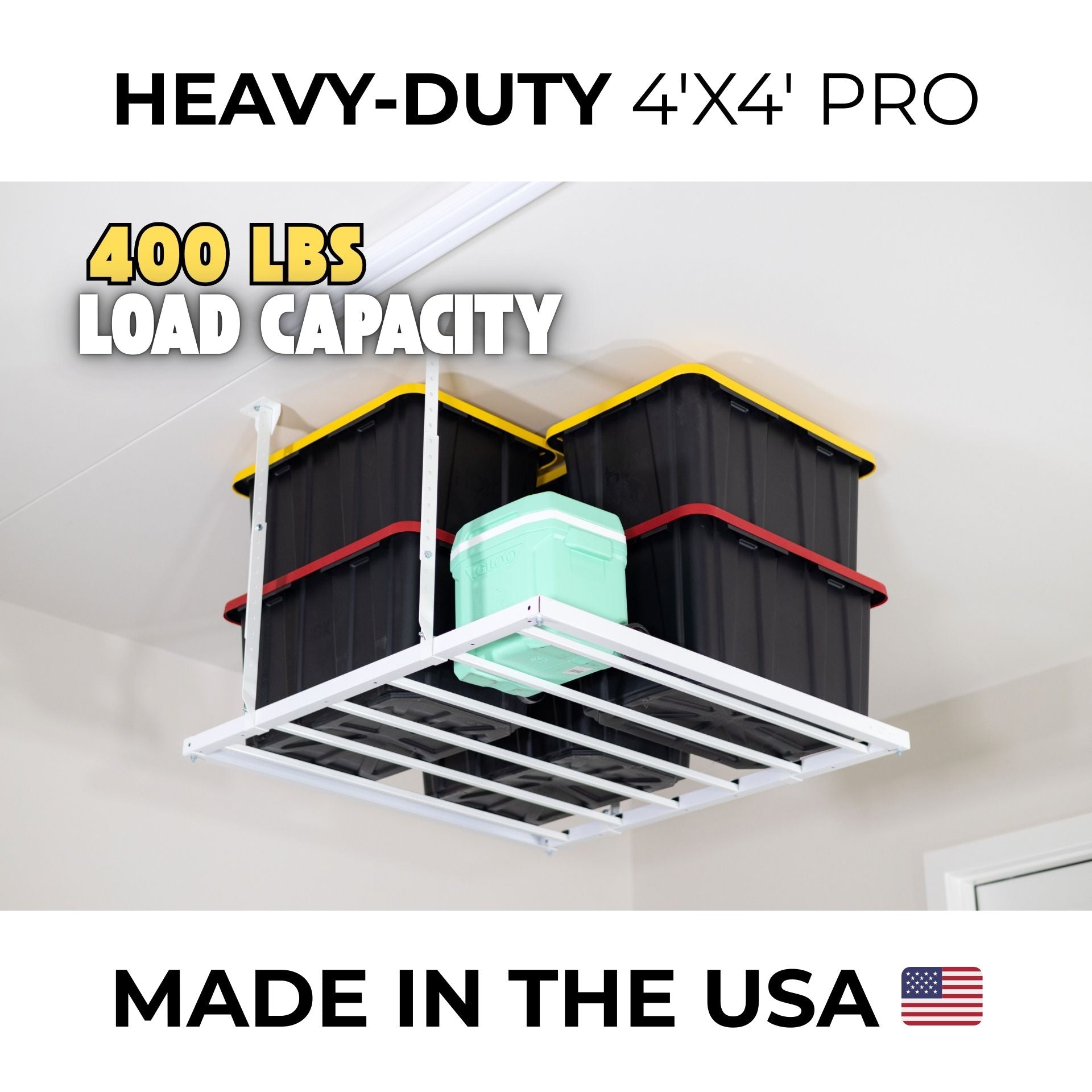 The 4'X4' Heavy-Duty Pro delivers professional-grade storage in a space-saving design. Built with the same durable steel construction and proven engineering as our larger systems, this compact overhead storage solution maximizes vertical space without requiring extensive square footage.